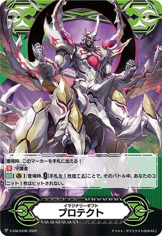 獲得時、このマーカーを手札に加える!【永】:守護者【自】【(G)】:登場時、【コスト】[手札を1枚捨てる]ことで、そのバトル中、あなたのユニット1枚はヒットされない。