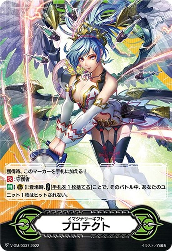 獲得時、このマーカーを手札に加える!【永】:守護者【自】【(G)】:登場時、【コスト】[手札を1枚捨てる]ことで、そのバトル中、あなたのユニット1枚はヒットされない。
