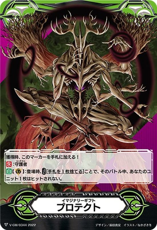 獲得時、このマーカーを手札に加える!【永】:守護者【自】【(G)】:登場時、【コスト】[手札を1枚捨てる]ことで、そのバトル中、あなたのユニット1枚はヒットされない。