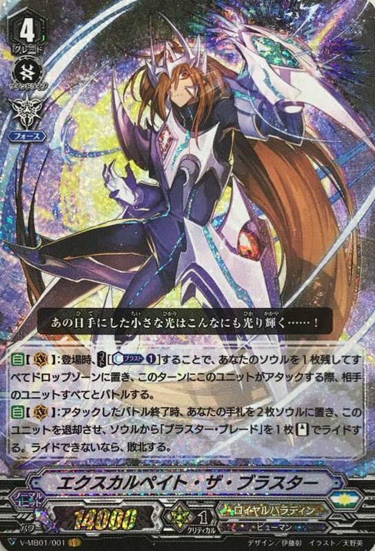【自】【(V)】:登場時、【コスト】[【カウンターブラスト】(1)]することで、あなたのソウルを1枚残してすべてドロップゾーンに置き、このターンにこのユニットがアタックする際、相手のユニットすべてとバトルする。【自】【(V)】:アタックしたバトル終了時、あなたの手札を2枚ソウルに置き、このユニットを退却させ、ソウルから「ブラスター・ブレード」を1枚【スタンド】でライドする。ライドできないなら、敗北する。
