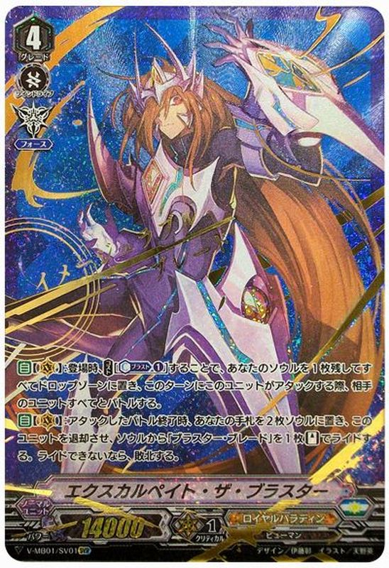 【自】【(V)】:登場時、【コスト】[【カウンターブラスト】(1)]することで、あなたのソウルを1枚残してすべてドロップゾーンに置き、このターンにこのユニットがアタックする際、相手のユニットすべてとバトルする。【自】【(V)】:アタックしたバトル終了時、あなたの手札を2枚ソウルに置き、このユニットを退却させ、ソウルから「ブラスター・ブレード」を1枚【スタンド】でライドする。ライドできないなら、敗北する。