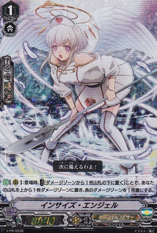 【自】【(R)】:登場時、【コスト】[ダメージゾーンから1枚山札の下に置く]ことで、あなたの山札を上から1枚ダメージゾーンに置き、表のダメージゾーンを1枚裏にする。