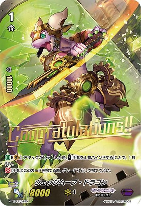 【自】【(V)】:アタックがヒットした時、【コスト】[手札を1枚バインドする]ことで、1枚引く。【永】【手札】:このカードを捨てる際、グレード3として捨ててよい。