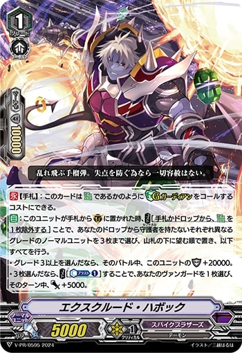 【永】【手札】:このカードは【治】であるかのように【Gガーディアン】をコールするコストにできる。【自】:このユニットが手札から(G)に置かれた時、【コスト】[手札かドロップから、【治】を1枚除外する]ことで、あなたのドロップから守護者を持たないそれぞれ異なるグレードのノーマルユニットを3枚まで選び、山札の下に望む順で置き、以下すべてを行う。・グレード3以上を選んだなら、そのバトル中、このユニットのシールド+20000。・3枚選んだなら、【コスト】[【カウンターブラスト】(1)]することで、あなたのヴァンガードを1枚選び、そのターン中、パワー+5000。