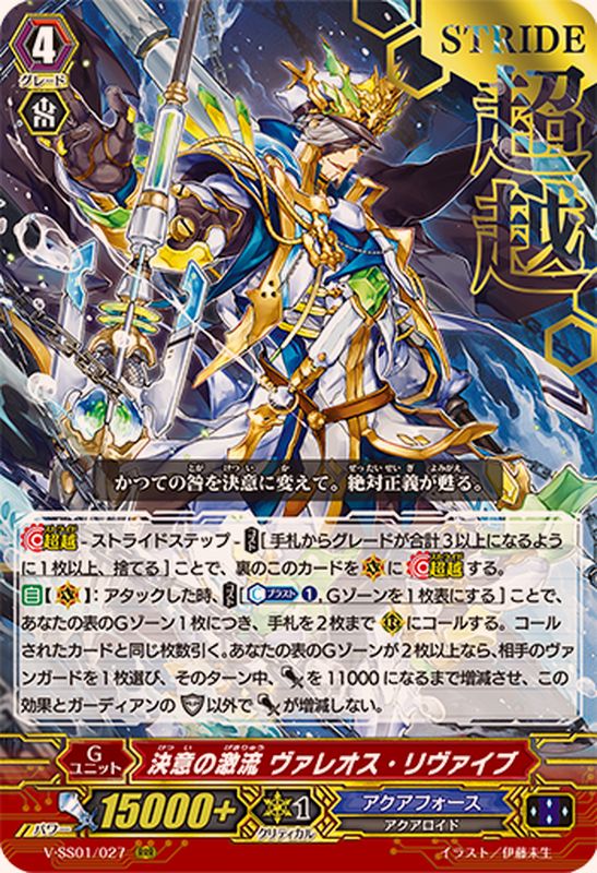 【超越】-ストライドステップ-【コスト】[手札からグレードが合計3以上になるように1枚以上、捨てる]ことで、裏のこのカードを(V)に【超越】する。【自】【(V)】:アタックした時、【コスト】[【カウンターブラスト】(1),Gゾーンを1枚表にする]ことで、あなたの表のGゾーン1枚につき、手札を2枚まで(R)にコールする。コールされたカードと同じ枚数引く。あなたの表のGゾーンが2枚以上なら、相手のヴァンガードを1枚選び、そのターン中、パワーを11000になるまで増減させ、この効果とガーディアンのシールド以外でパワーが増減しない。