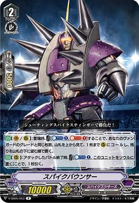 【自】【(V)/(R)】:登場時、【コスト】[【カウンターブラスト】(1),【ソウルブラスト】(1)]することで、あなたのヴァンガードのグレードと同じ枚数、山札を上から見て、1枚まで(R)にコールし、残りを山札の下に望む順で置く。【自】【(R)】:アタックしたバトル終了時、【コスト】[【カウンターブラスト】(1),このユニットをソウルに置く]ことで、1枚引く。