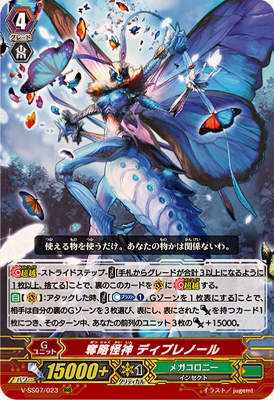 【超越】-ストライドステップ-【コスト】[手札からグレードが合計3以上になるように1枚以上、捨てる]ことで、裏のこのカードを(V)に【超越】する。【自】【(V)】:アタックした時、【コスト】[【カウンターブラスト】(1),Gゾーンを1枚表にする]ことで、相手は自分の裏のGゾーンを3枚選び、表にし、表にされたパワーを持つカード1枚につき、そのターン中、あなたの前列のユニット3枚のパワー+15000。