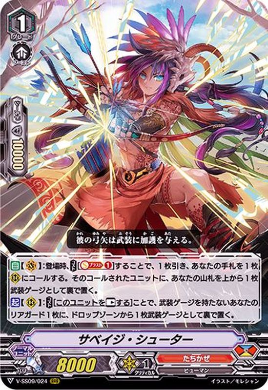 【自】【(V)】:登場時、【コスト】[【ソウルブラスト】(1)]することで、1枚引き、あなたの手札を1枚(R)にコールする。そのコールされたユニットに、あなたの山札を上から1枚武装ゲージとして裏で置く。【起】【(R)】:【コスト】[このユニットを【レスト】する]ことで、武装ゲージを持たないあなたのリアガード1枚に、ドロップゾーンから1枚武装ゲージとして裏で置く。