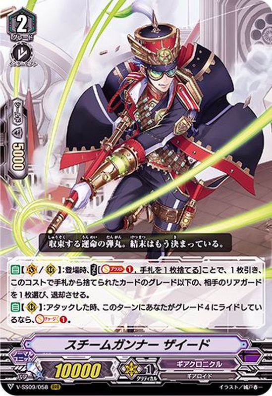 【自】【(V)/(R)】:登場時、【コスト】[【ソウルブラスト】(1),手札を1枚捨てる]ことで、1枚引き、このコストで手札から捨てられたカードのグレード以下の、相手のリアガードを1枚選び、退却させる。【自】【(R)】:アタックした時、このターンにあなたがグレード4にライドしているなら、【ソウルチャージ】(1)。