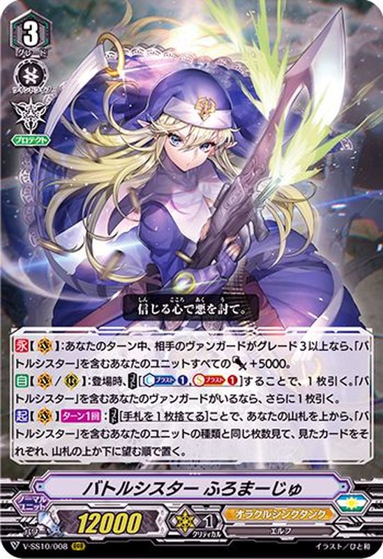 【永】【(V)】:あなたのターン中、相手のヴァンガードがグレード3以上なら、「バトルシスター」を含むあなたのユニットすべてのパワー+5000。【自】【(V)/(R)】:登場時、【コスト】[【カウンターブラスト】(1),【ソウルブラスト】(1)]することで、1枚引く。「バトルシスター」を含むあなたのヴァンガードがいるなら、さらに1枚引く。【起】【(V)】【ターン1回】:【コスト】[手札を1枚捨てる]ことで、あなたの山札を上から、「バトルシスター」を含むあなたのユニットの種類と同じ枚数見て、見たカードをそれぞれ、山札の上か下に望む順で置く。