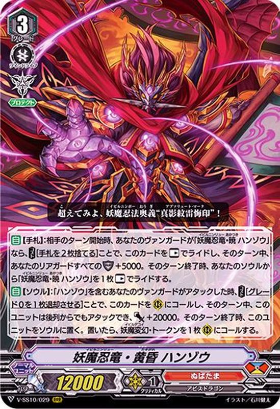 【自】【手札】:相手のターン開始時、あなたのヴァンガードが「妖魔忍竜・暁 ハンゾウ」なら、【コスト】[手札を2枚捨てる]ことで、このカードを【レスト】でライドし、そのターン中、あなたのリアガードすべてのシールド+5000。そのターン終了時、あなたのソウルから「妖魔忍竜・暁 ハンゾウ」を1枚【レスト】でライドする。【自】【ソウル】:「ハンゾウ」を含むあなたのヴァンガードがアタックした時、【コスト】[グレード0を1枚退却させる]ことで、このカードを(R)にコールし、そのターン中、このユニットは後列からでもアタックでき、パワー+20000。そのターン終了時、このユニットをソウルに置く。置いたら、妖魔変幻・トークンを1枚(R)にコールする。