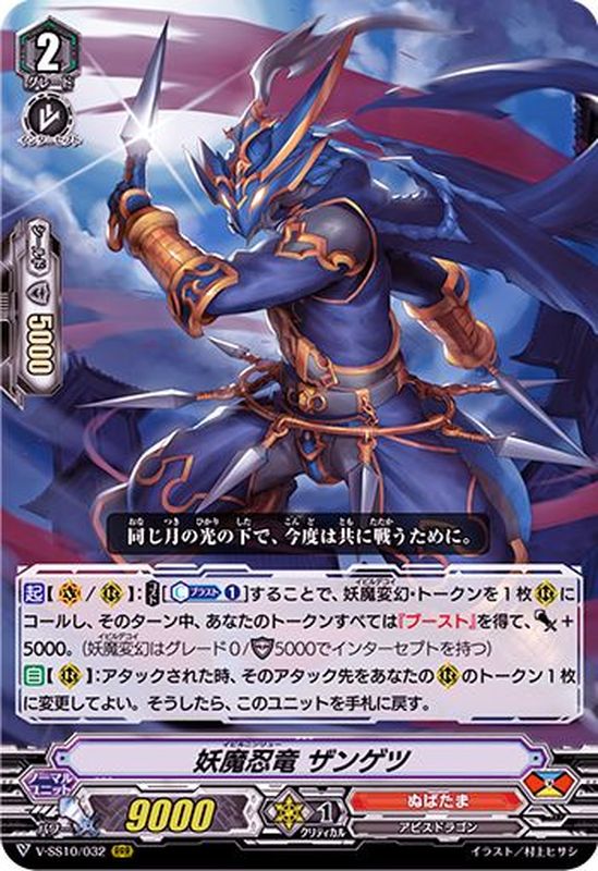【起】【(V)/(R)】:【コスト】[【カウンターブラスト】(1)]することで、妖魔変幻・トークンを1枚(R)にコールし、そのターン中、あなたのトークンすべては『ブースト』を得て、パワー+5000。(妖魔変幻はグレード0/シールド5000でインターセプトを持つ)【自】【(R)】:アタックされた時、そのアタック先をあなたの(R)のトークン1枚に変更してよい。そうしたら、このユニットを手札に戻す。