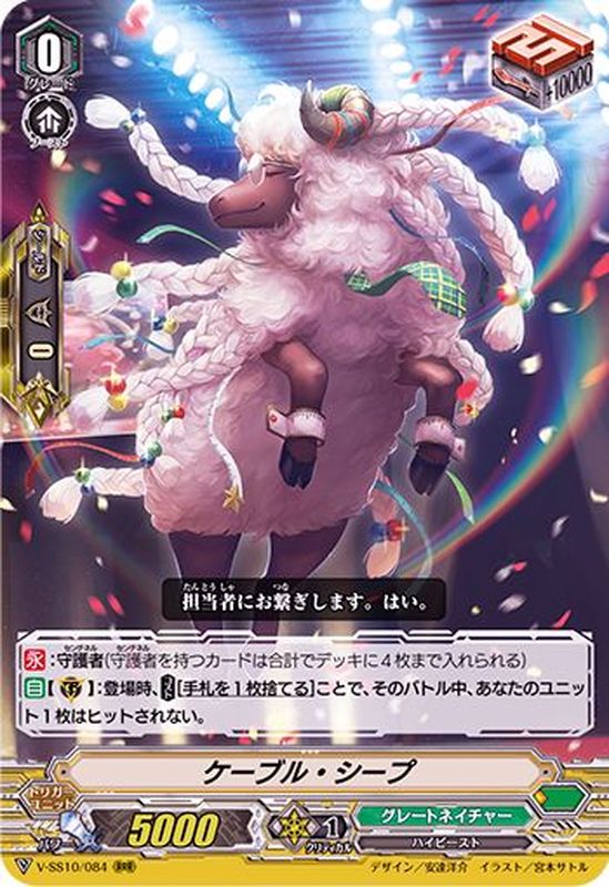 【永】:守護者(守護者を持つカードは合計でデッキに4枚まで入れられる)【自】【(G)】:登場時、【コスト】[手札を1枚捨てる]ことで、そのバトル中、あなたのユニット1枚はヒットされない。