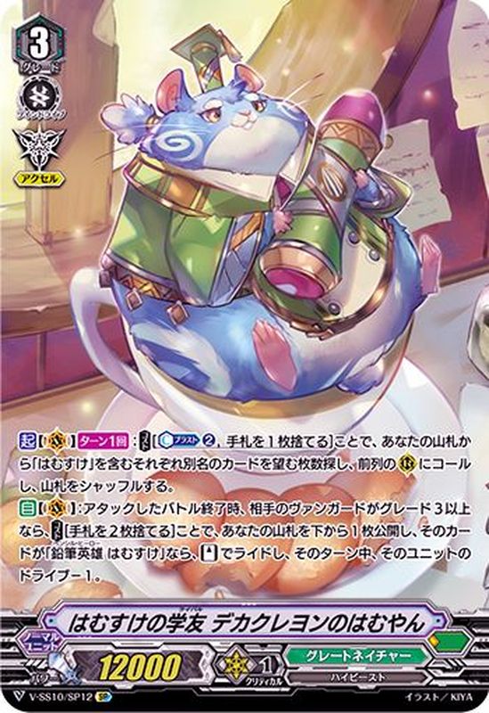 【起】【(V)】【ターン1回】:【コスト】[【カウンターブラスト】(2),手札を1枚捨てる]ことで、あなたの山札から「はむすけ」を含むそれぞれ別名のカードを望む枚数探し、前列の(R)にコールし、山札をシャッフルする。【自】【(V)】:アタックしたバトル終了時、相手のヴァンガードがグレード3以上なら、【コスト】[手札を2枚捨てる]ことで、あなたの山札を下から1枚公開し、そのカードが「鉛筆英雄 はむすけ」なら、【スタンド】でライドし、そのターン中、そのユニットのドライブ-1。