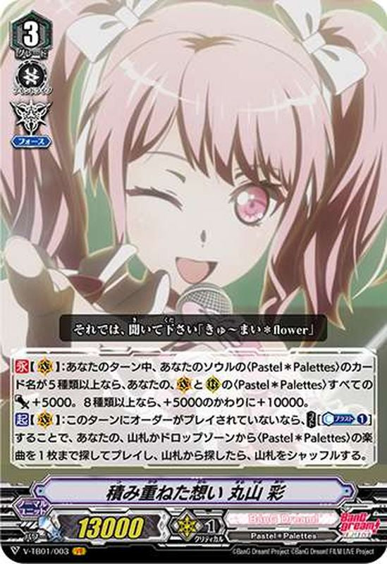 【永】【(V)】:あなたのターン中、あなたのソウルの〈Pastel*Palettes〉のカード名が5種類以上なら、あなたの、(V)と(R)の〈Pastel*Palettes〉すべてのパワー+5000。8種類以上なら、+5000のかわりに+10000。【起】【(V)】:このターンにオーダーがプレイされていないなら、【コスト】[【カウンターブラスト】(1)]することで、あなたの、山札かドロップゾーンから〈Pastel*Palettes〉の楽曲を1枚まで探してプレイし、山札から探したら、山札をシャッフルする。