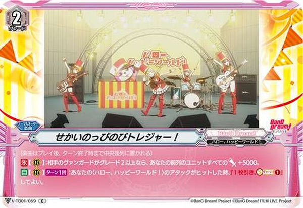 (楽曲はプレイ後、ターン終了時まで中央後列に置かれる)【永】【(R)】:相手のヴァンガードがグレード2以上なら、あなたの前列のユニットすべてのパワー+5000。【自】【(R)】【ターン1回】:あなたの〈ハロー、ハッピーワールド!〉のアタックがヒットした時、『1枚引き、【ソウルチャージ】(1)』してよい。