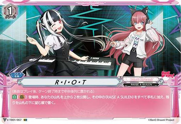 (楽曲はプレイ後、ターン終了時まで中央後列に置かれる)【自】【(R)】:登場時、あなたの山札を上から2枚公開し、その中の〈RAISE A SUILEN〉をすべて手札に加え、残りを山札の下に望む順で置く。