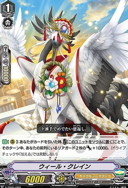 【自】【(R)】:あなたがカードを引いた時、【コスト】[このユニットをソウルに置く]ことで、そのターン中、あなたの前列にいるリアガード2枚のパワー+10000。(ドライブチェックや「加える」では発動しない)