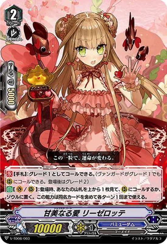 【永】【手札】:グレード1としてコールできる。(ヴァンガードがグレード1でも(R)にコールできる。登場後はグレード2)【自】【(V)/(R)】:登場時、あなたの山札を上から1枚見て、(R)にコールするか、ソウルに置く。この能力は同名カードを含めて各ターン1回まで使える。