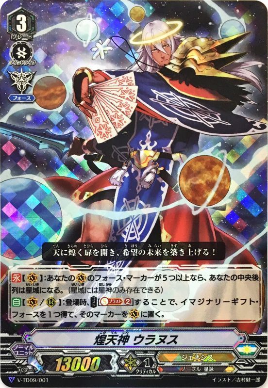 【永】【(V)】:あなたの(V)のフォース・マーカーが5つ以上なら、あなたの中央後列は星域になる。(星域には星神のみ存在できる)【自】【(V)/(R)】:登場時、【コスト】[【ソウルブラスト】(2)]することで、イマジナリーギフト・フォースを1つ得て、そのマーカーを(V)に置く。