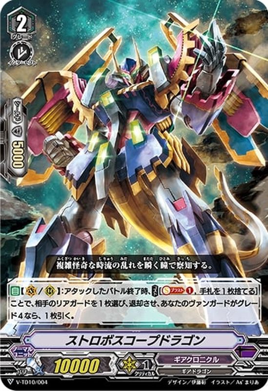 【自】【(V)/(R)】:アタックしたバトル終了時、【コスト】[【ソウルブラスト】(1),手札を1枚捨てる]ことで、相手のリアガードを1枚選び、退却させ、あなたのヴァンガードがグレード4なら、1枚引く。