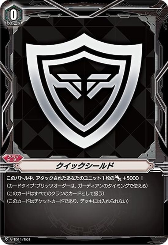 このバトル中、アタックされたあなたのユニット1枚のパワー+5000!(カードタイプ:ブリッツオーダーは、ガーディアンのタイミングで使える)(このカードはすべてのクランのカードとして扱う)(このカードはチケットカードであり、デッキには入れられない)