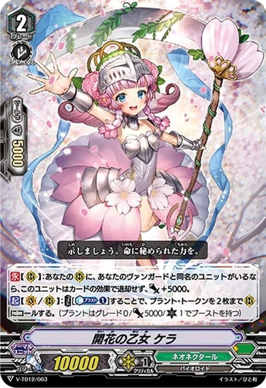 【永】【(R)】:あなたの(R)に、あなたのヴァンガードと同名のユニットがいるなら、このユニットはカードの効果で退却せず、パワー+5000。【起】【(V)/(R)】:【コスト】[【カウンターブラスト】(1)]することで、プラント・トークンを2枚まで(R)にコールする。(プラントはグレード0/パワー5000/クリティカル1でブーストを持つ)