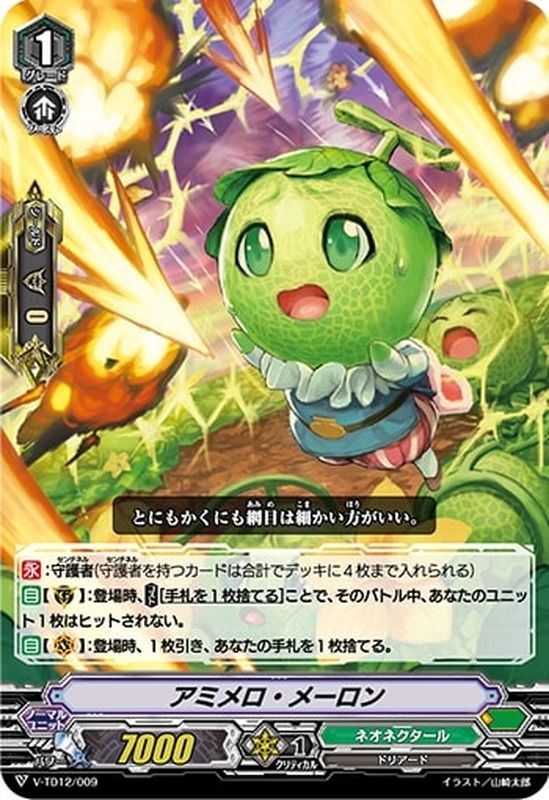 【永】:守護者(守護者を持つカードは合計でデッキに4枚まで入れられる)【自】【(G)】:登場時、【コスト】[手札を1枚捨てる]ことで、そのバトル中、あなたのユニット1枚はヒットされない。【自】【(V)】:登場時、1枚引き、あなたの手札を1枚捨てる。